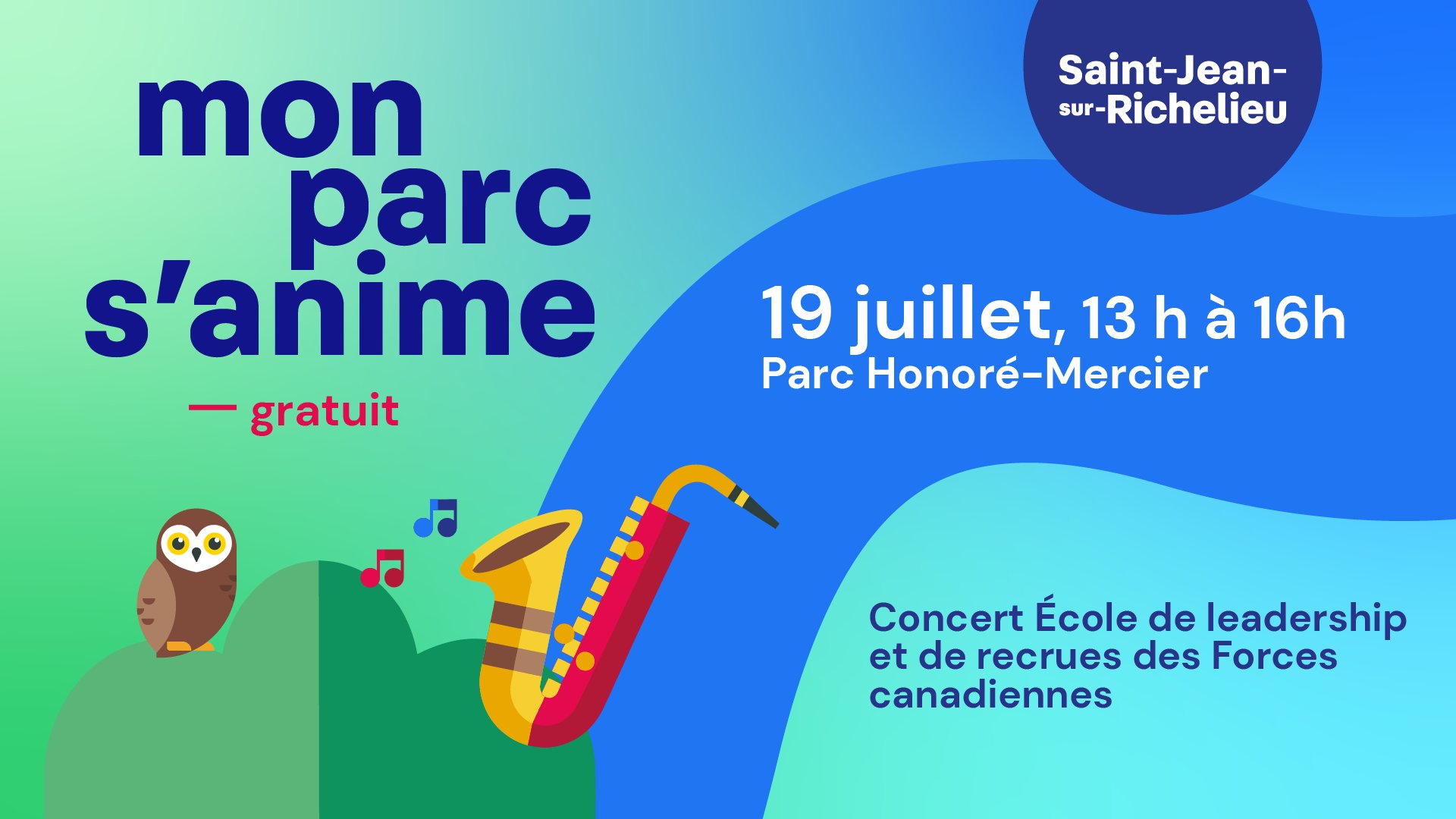 Ce samedi 19 juillet, le 𝗽𝗮𝗿𝗰 𝗛𝗼𝗻𝗼𝗿𝗲́-𝗠𝗲𝗿𝗰𝗶𝗲𝗿 𝘀’𝗮𝗻𝗶𝗺𝗲. Direction le Vieux-Iberville! 𝟏𝟑 𝐚̀ 𝟏𝟔 𝐡𝐞𝐮𝐫𝐞𝐬 | 𝐂𝐨𝐢𝐧 𝟗𝐞 𝐀𝐯𝐞𝐧𝐮𝐞 𝐞𝐭 𝟒𝐞 𝐑𝐮𝐞 Concert de l’École de leadership et de recrues des Forces canadiennes à 14 h Jeux géants en libre accès Animation ambulante avec l’Homme-orchestre Bienvenue à tous! d'info: https://sjsr.ca/loisirs/mon-parc-sanime/