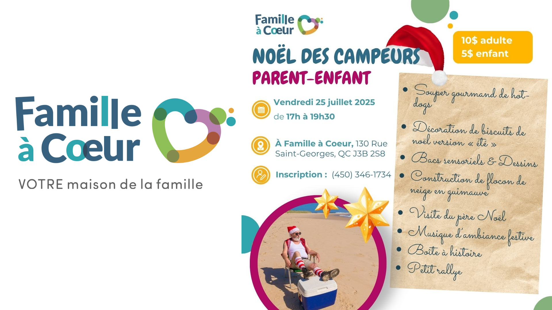 Noël en plein été, ça vous dit? Famille à Cœur vous invite à son Noël des campeurs, une soirée festive parent-enfant à ne pas manquer! Vendredi 25 juillet 2025 De 17h à 19h30 130 rue Saint-Georges, Saint-Jean-sur-Richelieu Inscription : 450 346-1734 10 $ adulte | 5 $ enfant Au programme : hot-dogs […]